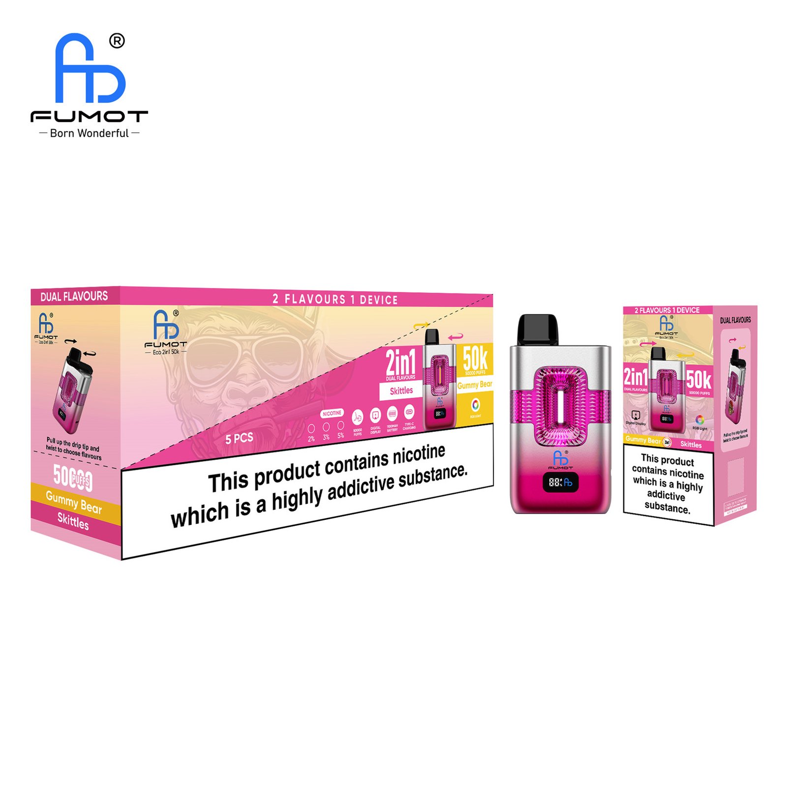 Für deutsche Gäste ist die Kombination von Geschmäckern «Gummibärchen» und « Skittles » auf die Fumot ECO 2-in-1 50K ist eine sehr clevere Strategie :