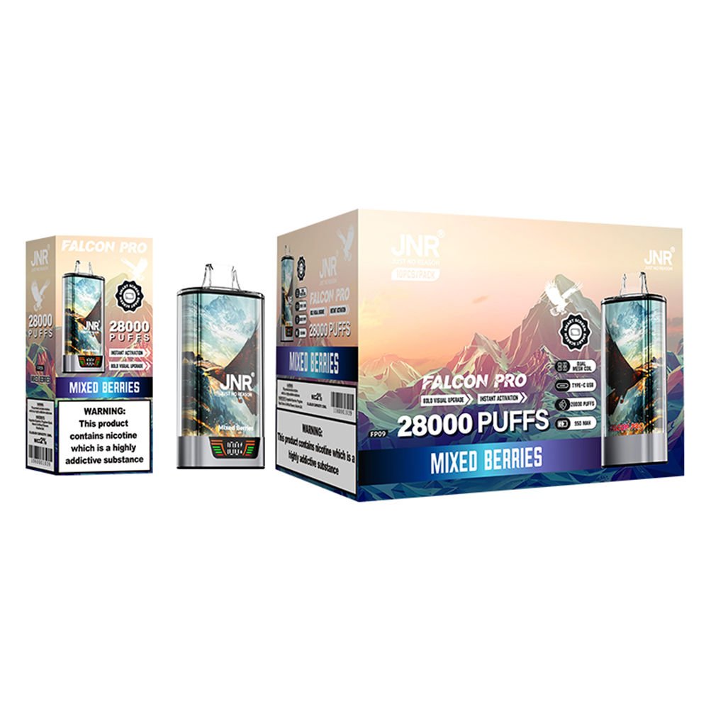 - Jede elektronische Zigarette JNR Falcon Pro 28000 Mixed Berries bietet etwa 28000 Züge.