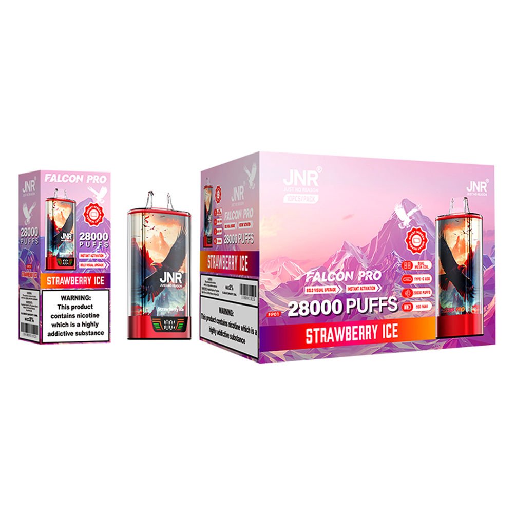 - Jede elektronische Zigarette JNR Falcon Pro 28000 Strawberry Ice bietet etwa 28000 Züge.