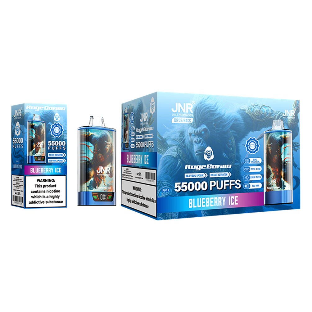 Chaque cigarette électronique JNR Rage Gorilla 55000 Blueberry Ice offre jusqu'à 55000 bouffées.